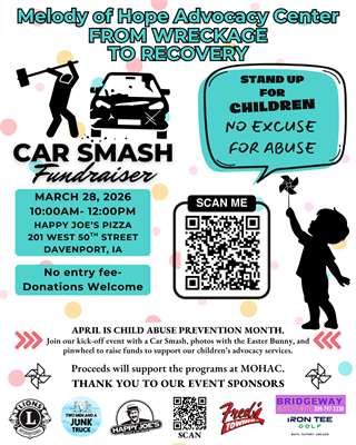 Join Melody of Hope Advocacy Center on March 28 from 10:00am to 12:00pm as we go "From Wreckage to Recovery" with a family friendly fundraiser. April is Child Abuse Prevention Month, and we are hosting a kick-off event with a Car Smash, photos with the Easter Bunny, and pinwheels to raise awareness and funds to support our children’s advocacy services. There is no set entry fee - Donations welcome. All proceeds will support programs at Melody of Hope Advocacy Center.
